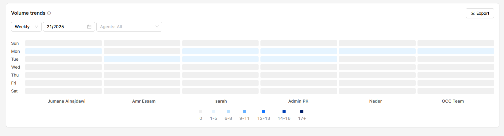 A visual heatmap that shows volume of conversations per agent across different days of the week.