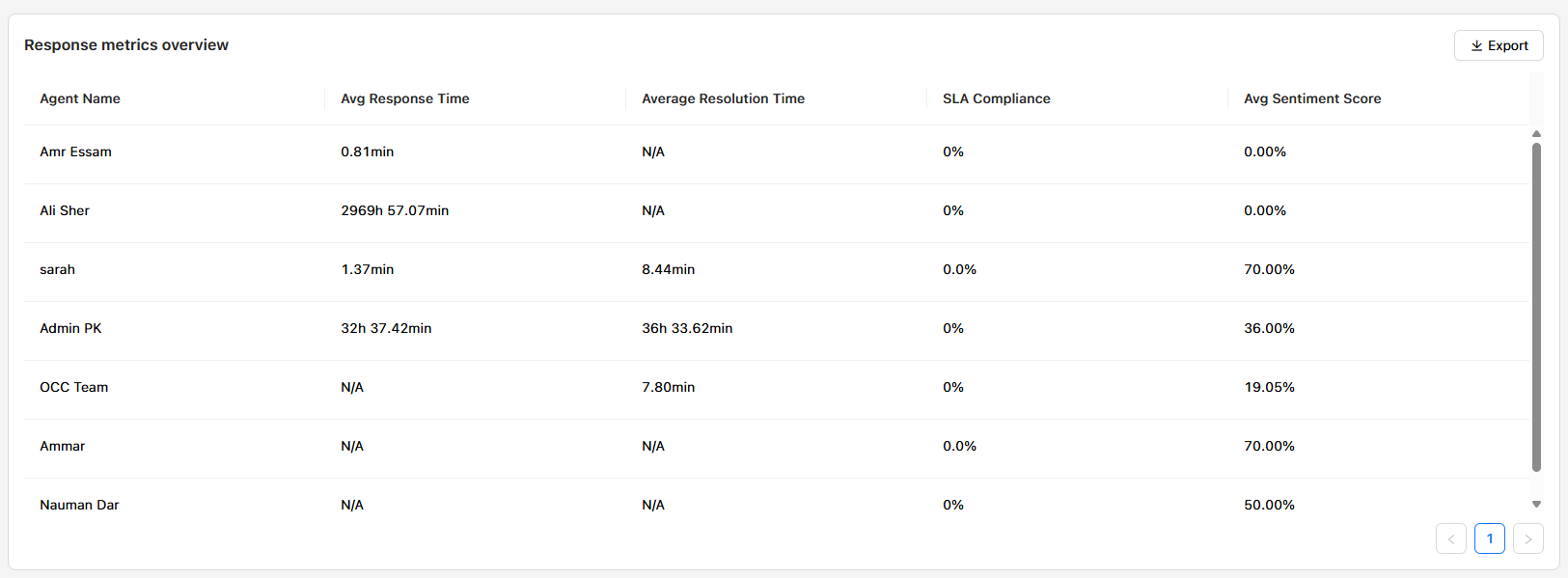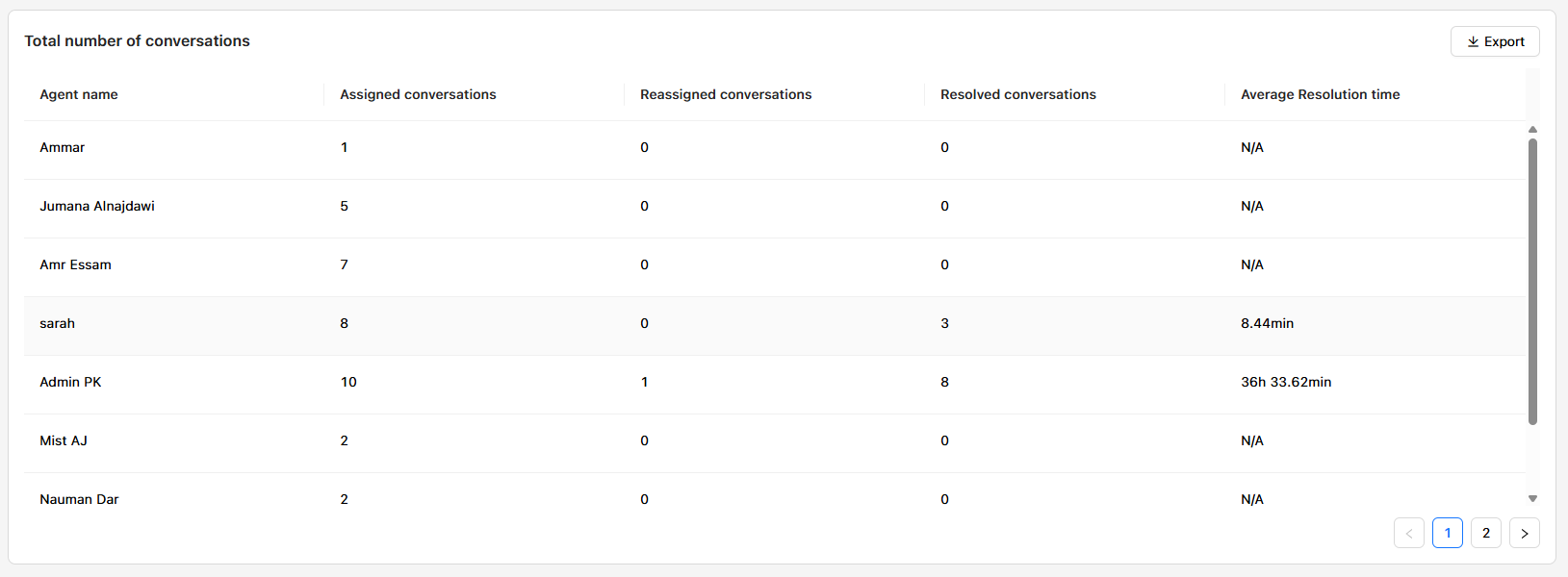 | Average Resolution Time | Time taken by the agent to resolve their assigned conversations. |