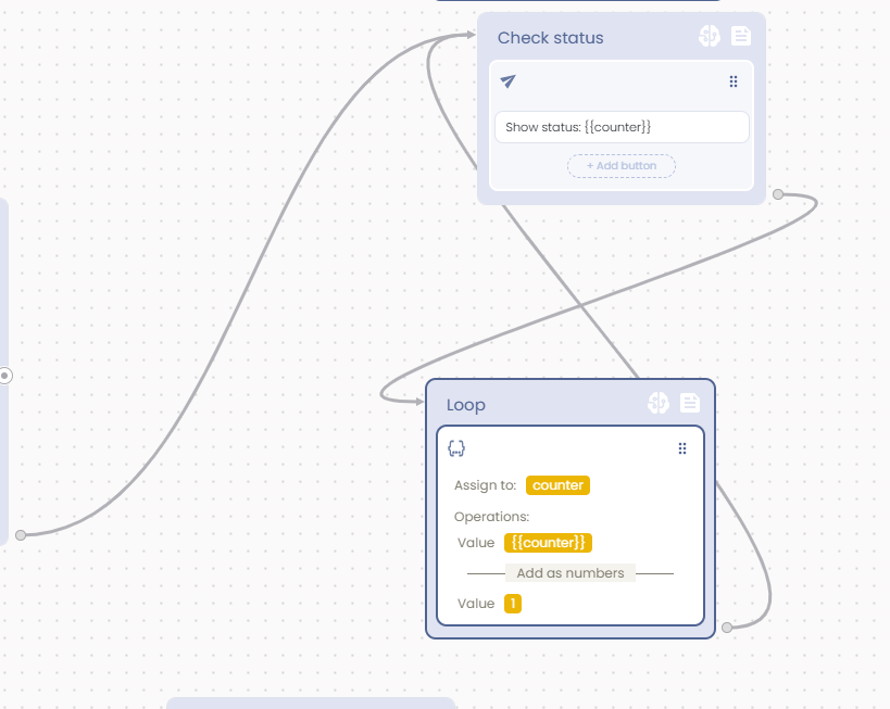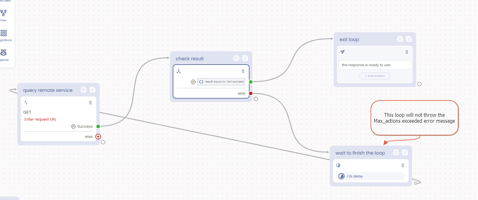 Sometimes it is anyway useful to have a loop in the background, for example, if you're polling some remote API to get some information necessary to choose the next action in the loop. In this case, if you think that the loop needs a lot of iterations to get the value you need, you can avoid the MAX_ACTIONS exceeded message simply by putting a Wait Action of at least 1 second delay in the middle of the loop, like in the following picture: