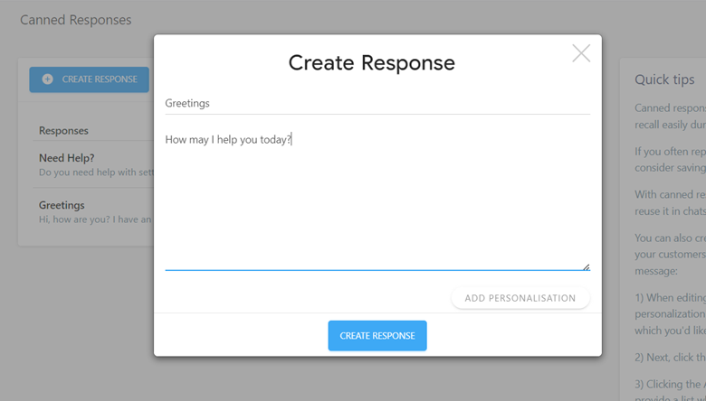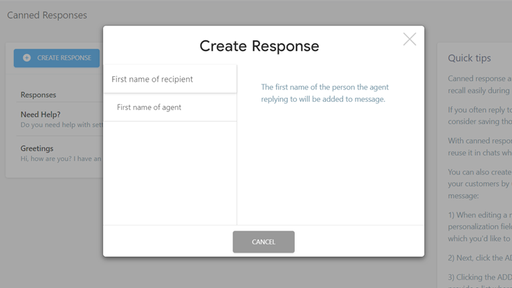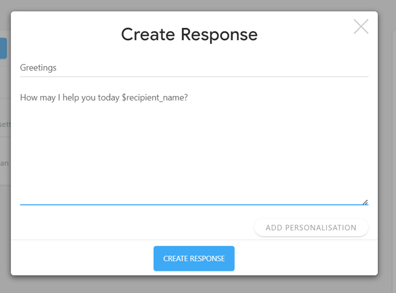 - It will appear in the message as ‘$recipient_name’. It will be replaced by the recipient's first name when the response is used. Click on Create Response, it will appear in the listing.