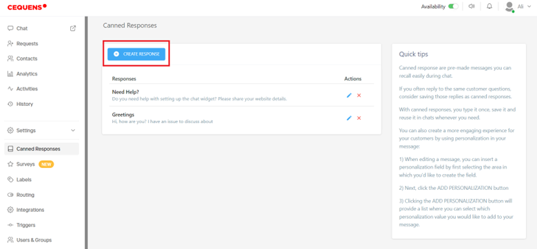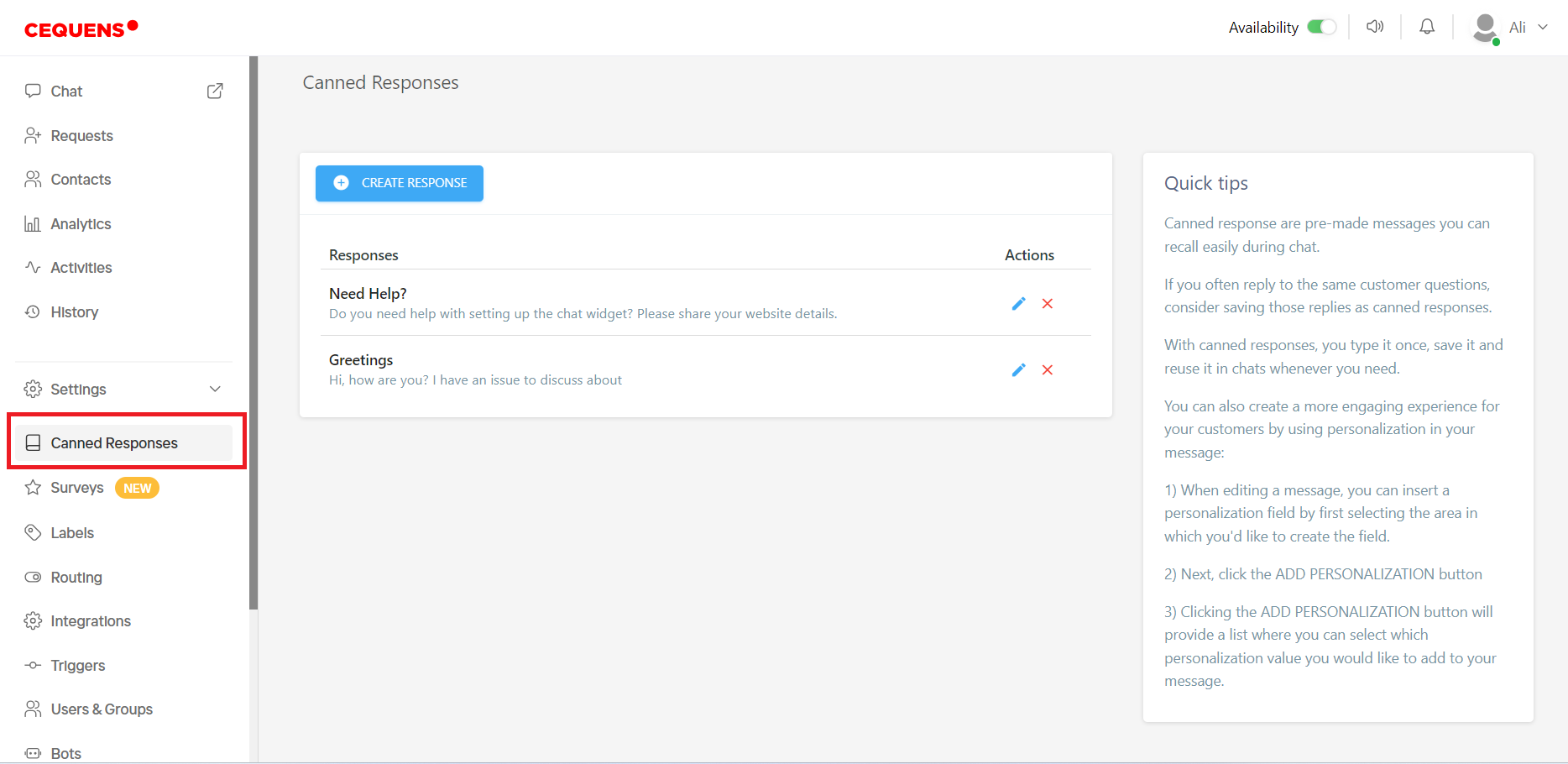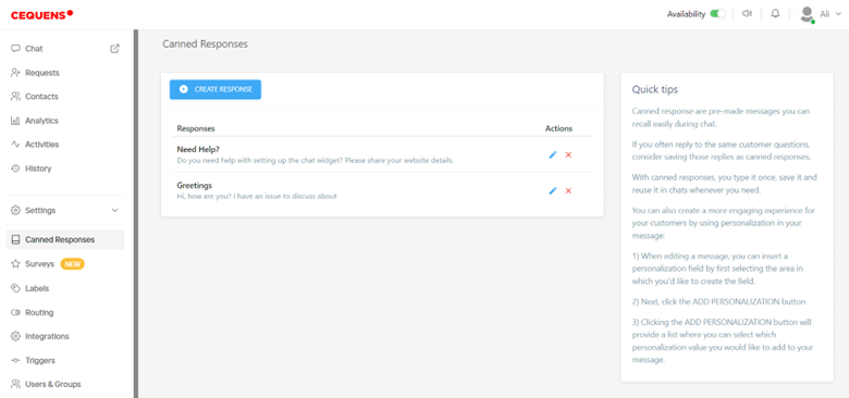 Canned Responses in CEQUENS Chat are pre-made messages designed to streamline customer support interactions. With this feature, agents can quickly access and deploy commonly used responses, saving time and ensuring consistent communication with customers. Creating and managing canned responses is simple, allowing agents to customize and organize responses to suit various customer inquiries and scenarios.