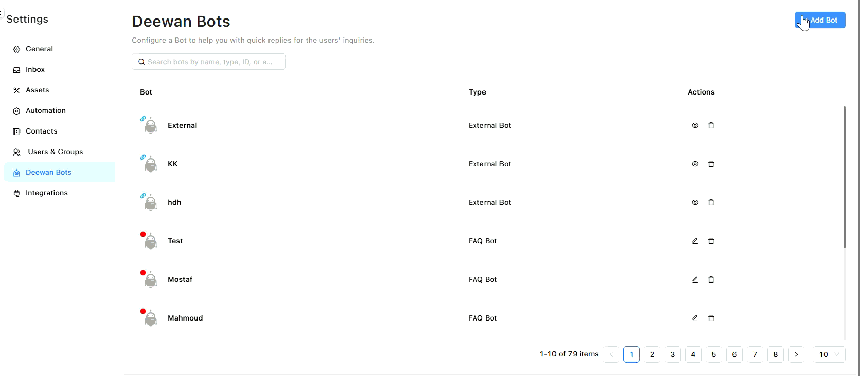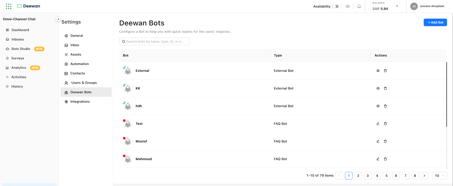 Connect and manage bots created in the Deewan Bot platform directly within your OCC inboxes. This integration provides a centralized view of all your automated conversation agents.