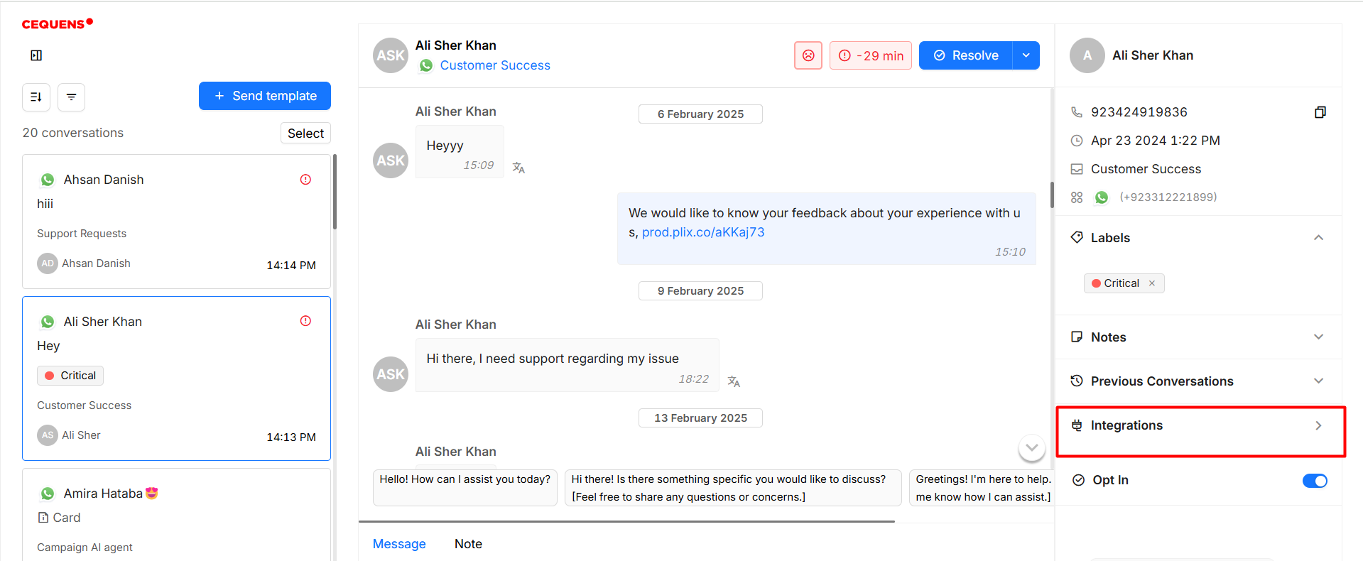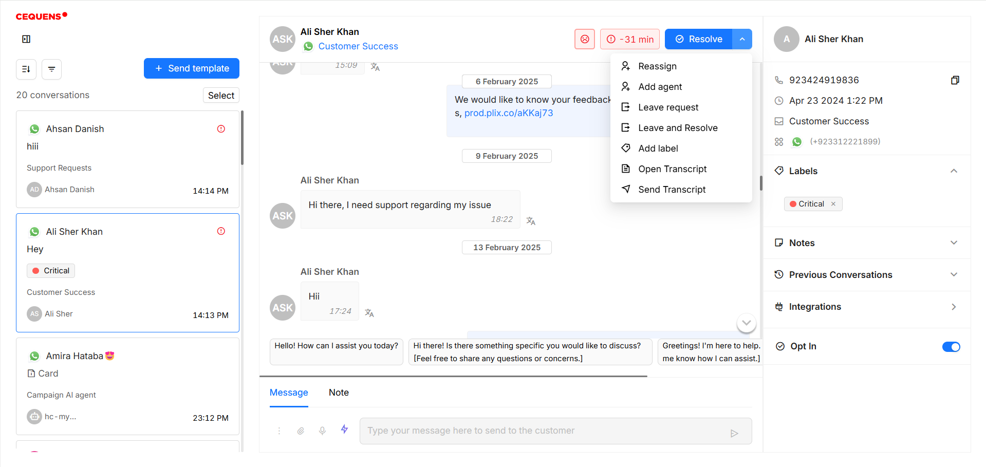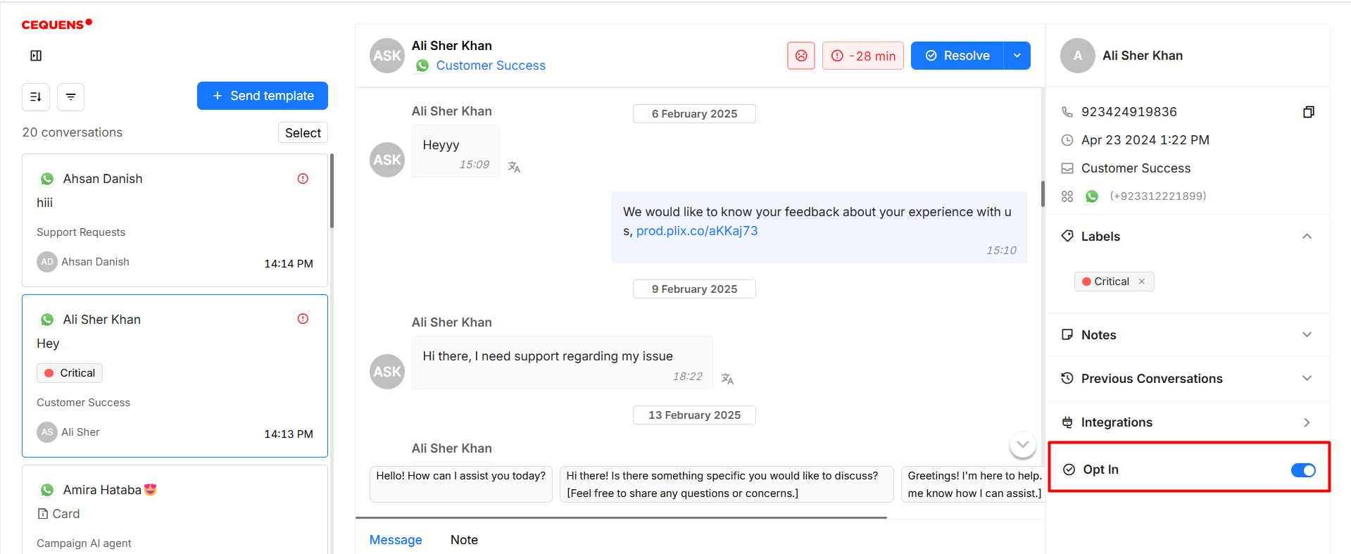 - On the right panel, you can also view agents, add labels, add notes, toggle Opt In, and integrate with other platforms.