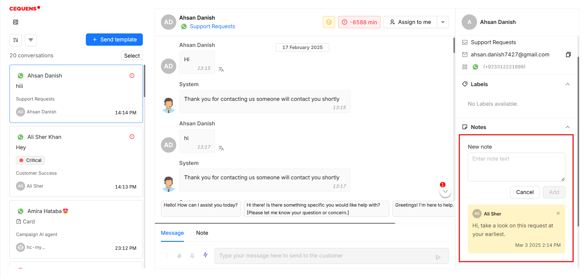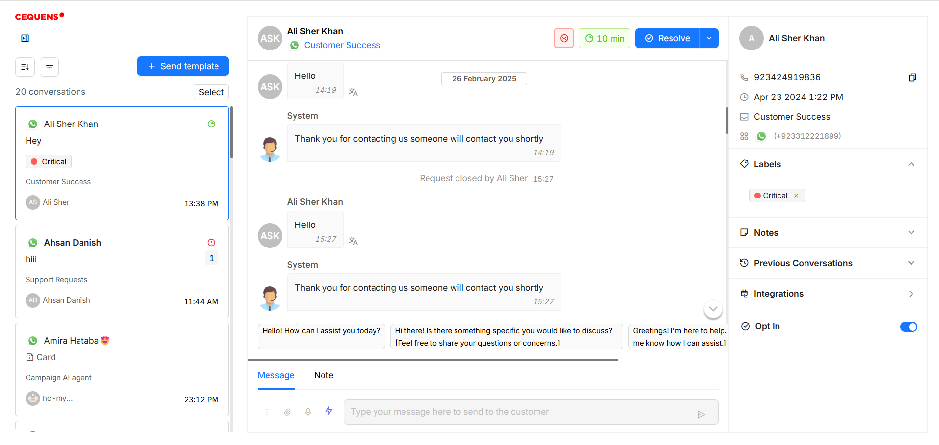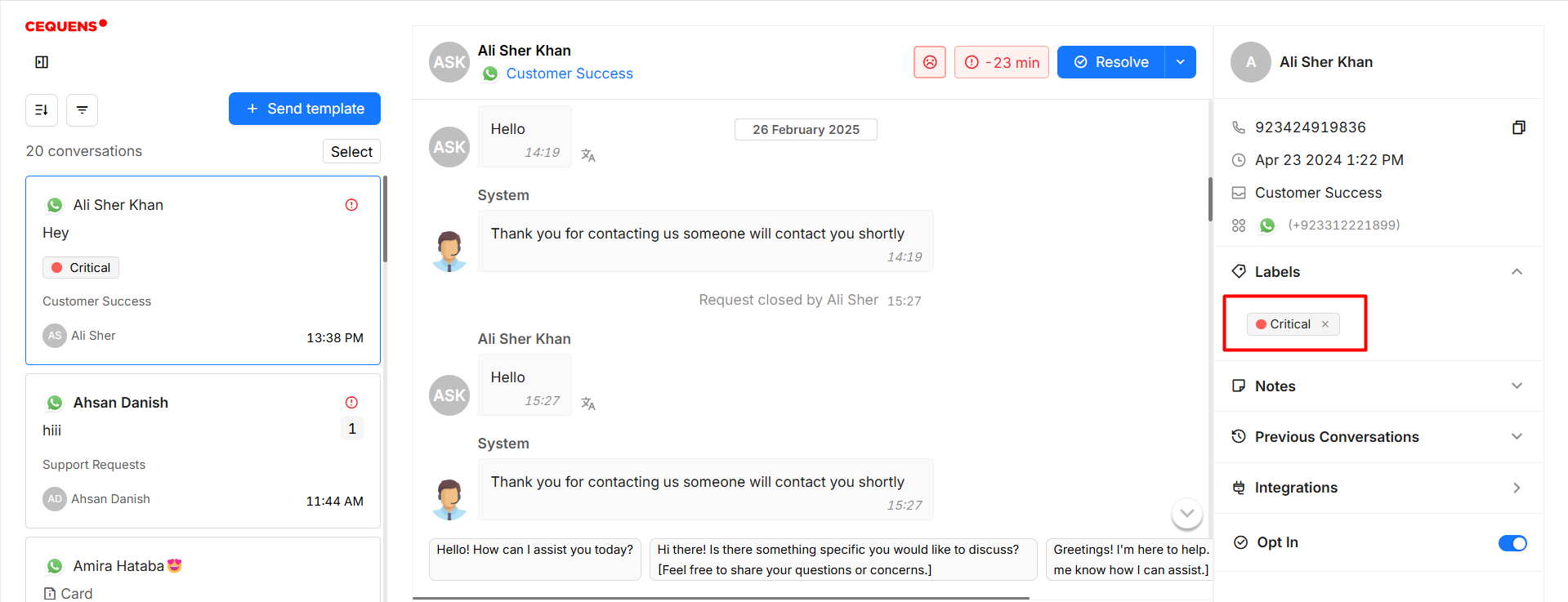 - On the right panel, you can also view agents, add labels, add notes, toggle Opt In, and integrate with other platforms.
