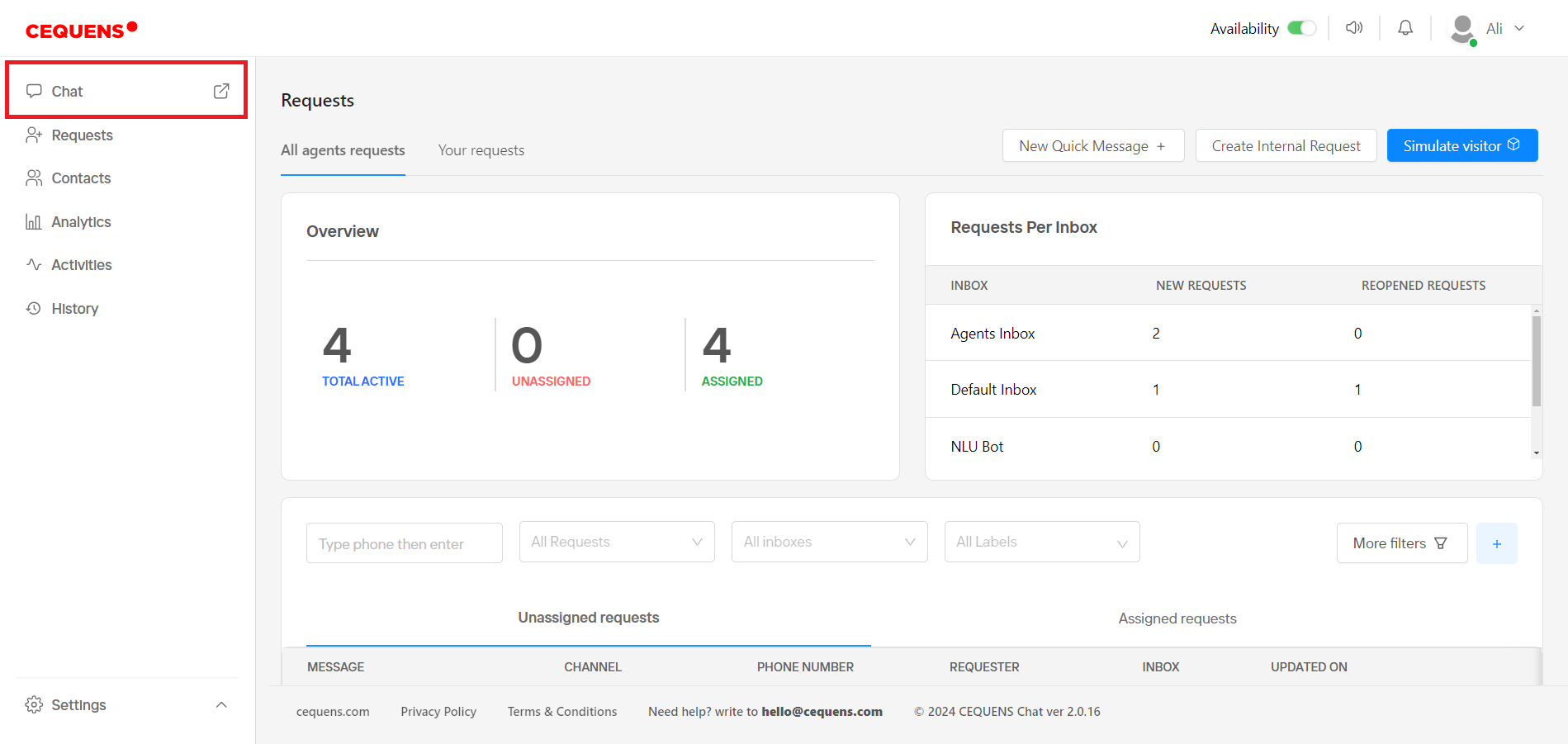 The Chat View Interface in CEQUENS allows agents to efficiently manage customer queries, access conversation transcripts, and collaborate with team members. It offers robust functionality, including options to reassign requests, add agents, and integrate with external platforms for enhanced productivity and streamlined communication.