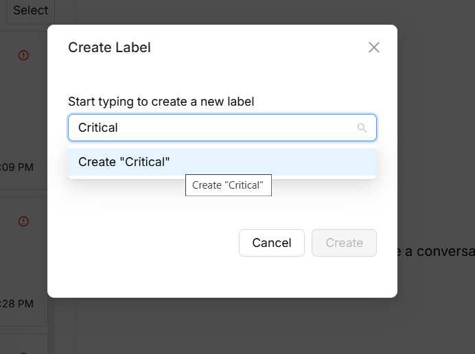 - On the pop-up, start typing the name of label and if label doesn't exist in the system, it will show you an option of Create label with this name.