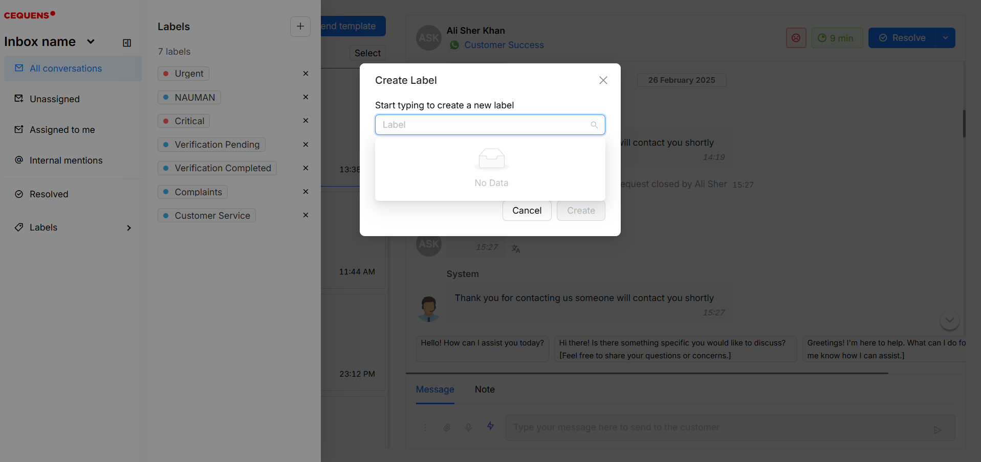 - Also, create labels by accessing the option of labels on the left sidebar and see the requests where you were mentioned by other agents by clicking internal mentions option.
