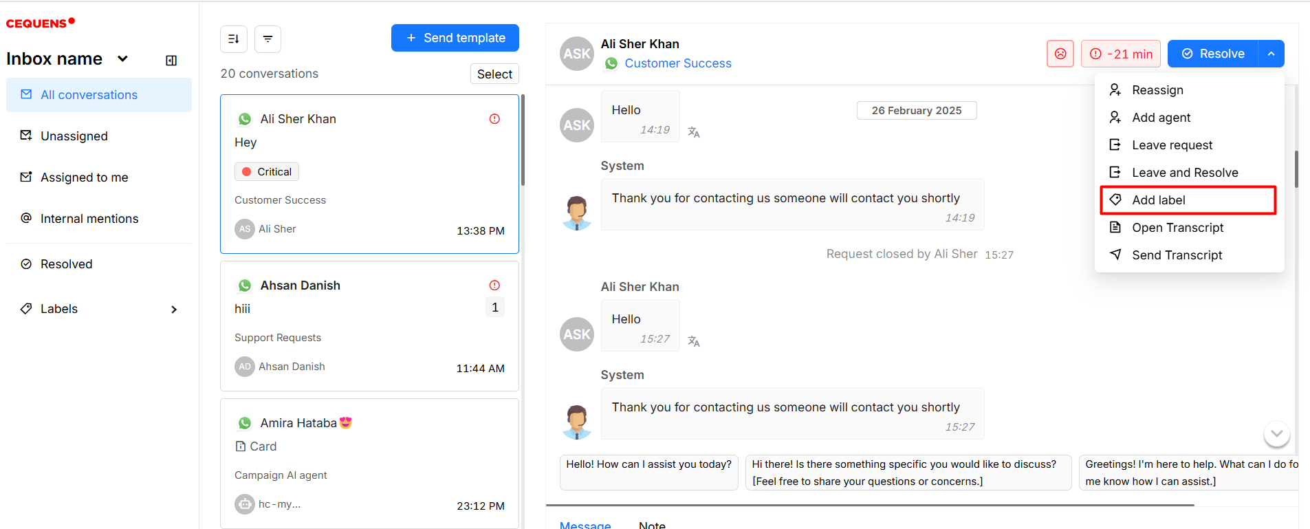 - From the actions menu, access options to reassign the request to another agent or inbox, add agent to involve another agent, leave request, leave and resolve, resolve only and also add label by clicking on add label option.