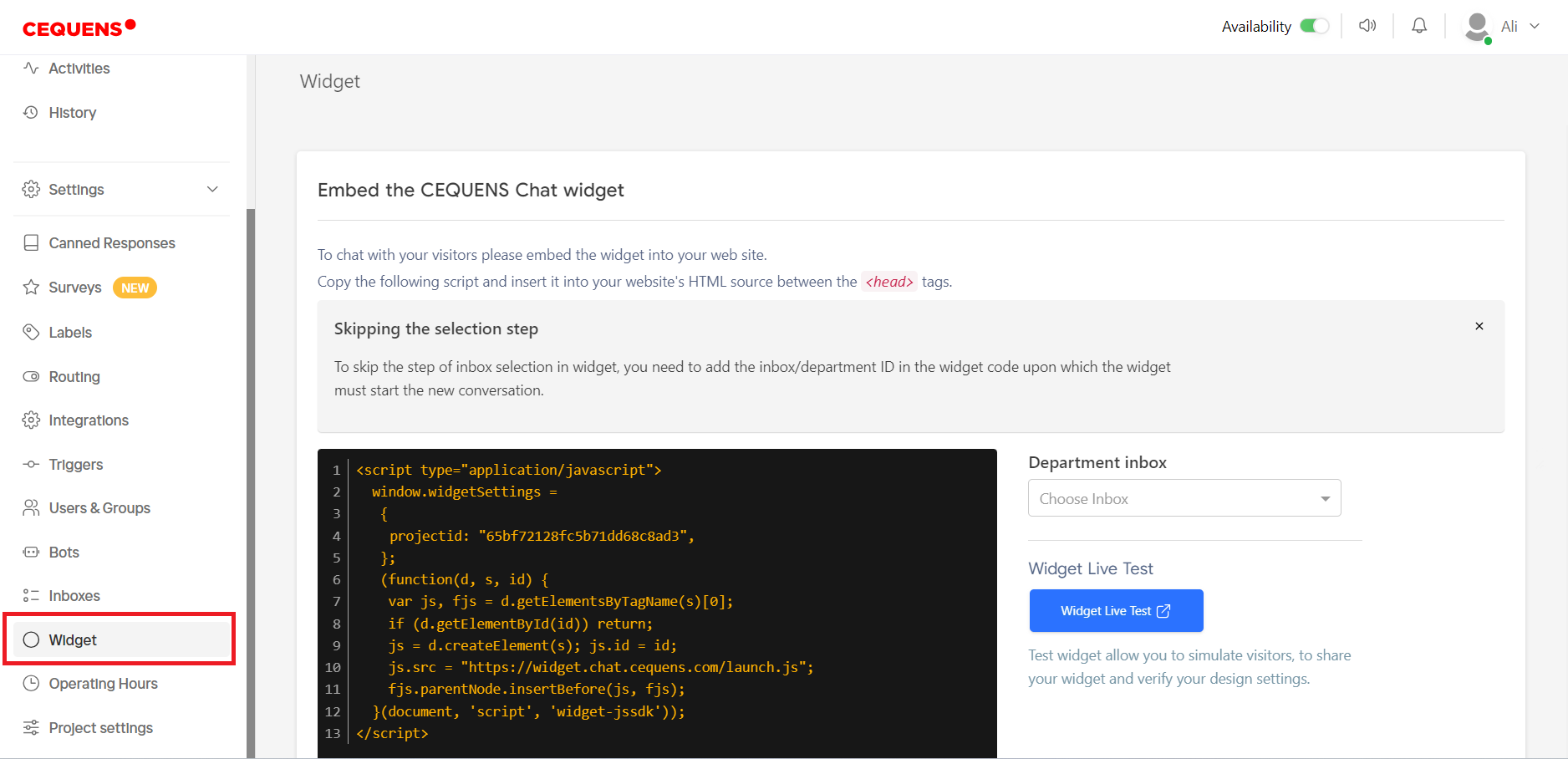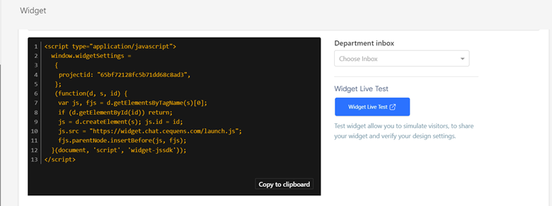 - Customize the widget by selecting an inbox and optionally adding the inbox/department ID in the widget code to designate where new conversations should commence.