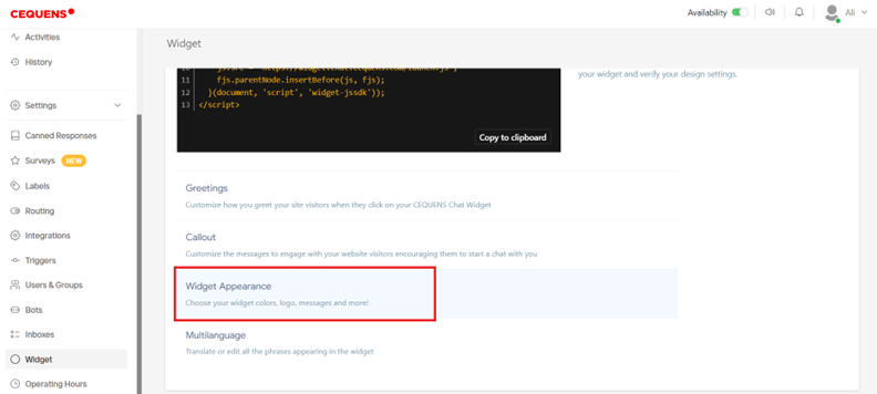 - Upon entering the Widget page, you'll find the script snippet, copy it and paste it in your website's HTML source code between the <head> tags.