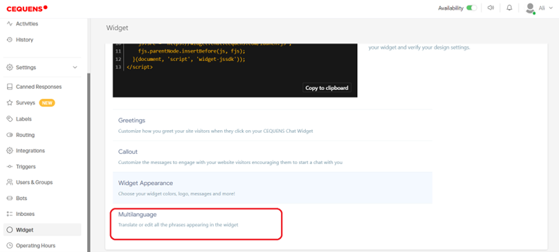 - For multilingual support, navigate to the Multilanguage option on the widget page.