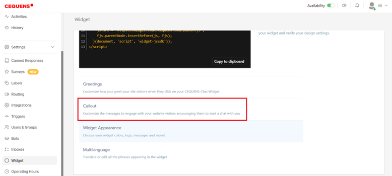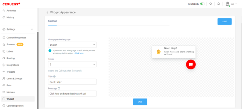 - Utilize the Callout option to provide additional information or prompts on the chat widget.
