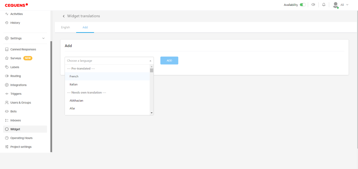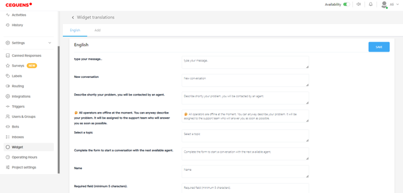 - Provide the English phrases in the English tab to be used in chat widget.