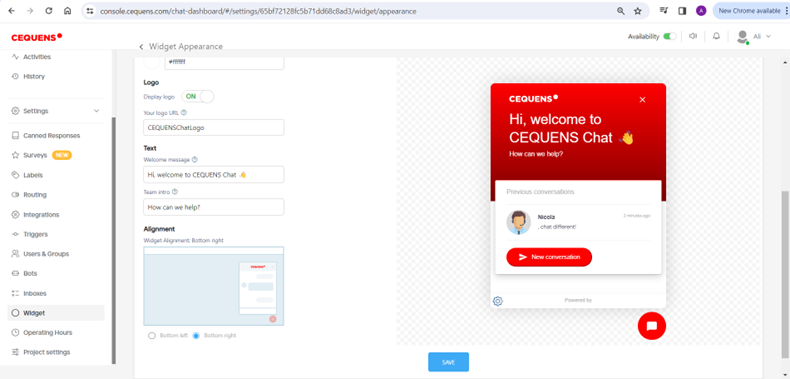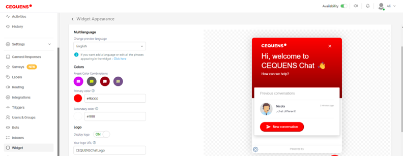 The "Chat Widget" feature in CEQUENS Chat settings offers users a streamlined method to integrate and customize a chat widget on their website.