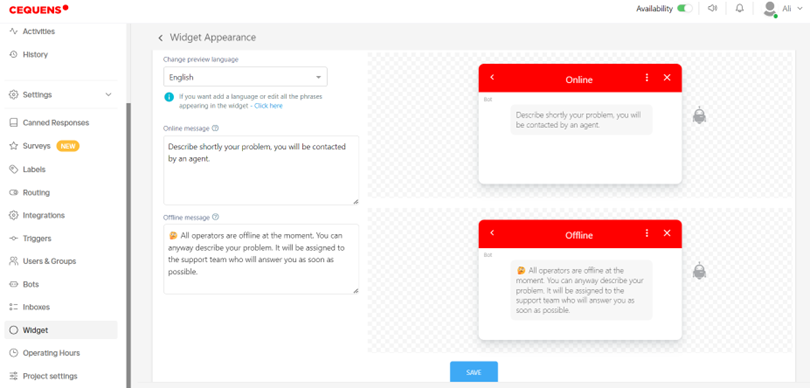 - Under the Greetings tab, specify the language preference and adjust the online and offline messages visible to visitors on the chat widget. Save your changes once configured.