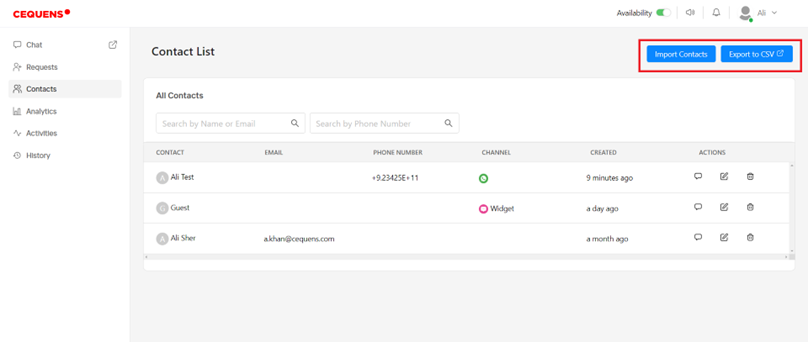 - For exporting contacts, click on the "Export to CSV" button to download a file containing all contacts.