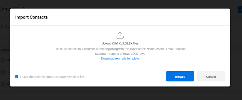 - To import contacts, click on the "Import Contacts" button. Follow the prompts to download a sample template file. Fill in the contact details according to the template, removing any instructions. Check the box confirming the file's accuracy, then upload the file. Upon successful upload, the contacts will appear on the listing page.