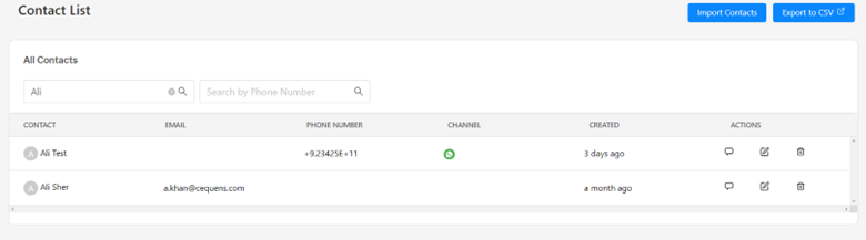 - Use the search function to find contacts by Name, Email, or Phone Number.