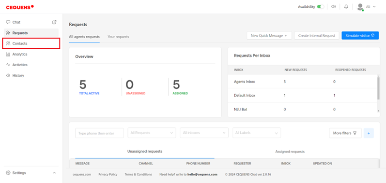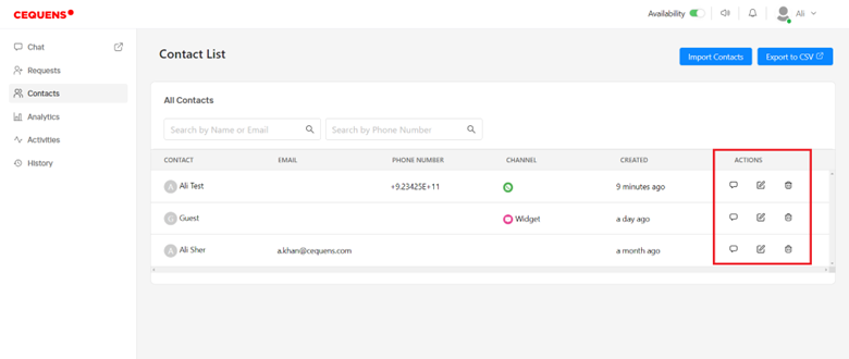 - In the "Actions" column, you can view contact requests, edit contact details, or delete contacts by clicking the respective icons. Note that editing a contact does not affect any associated contact requests.