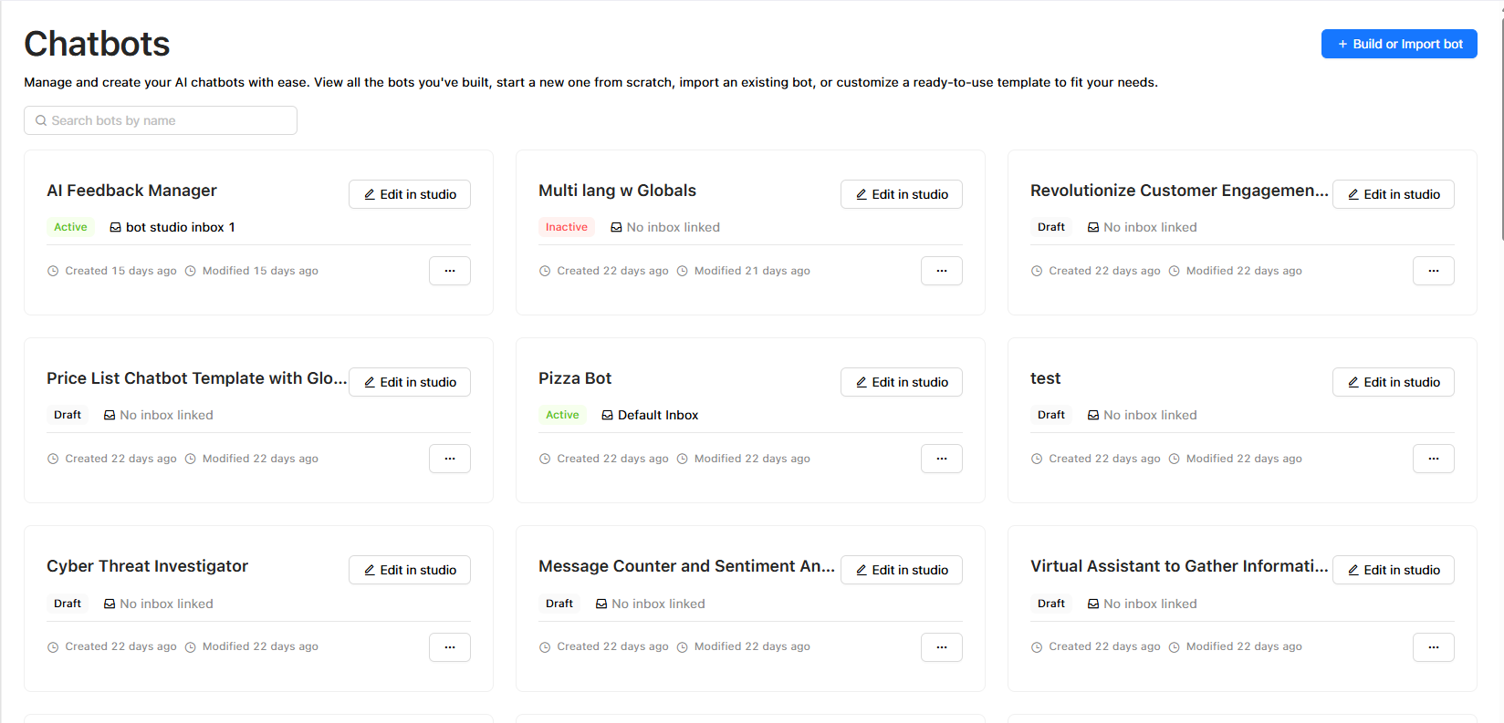 - In the "Bots" section, click the "Build or Import Bot" button.