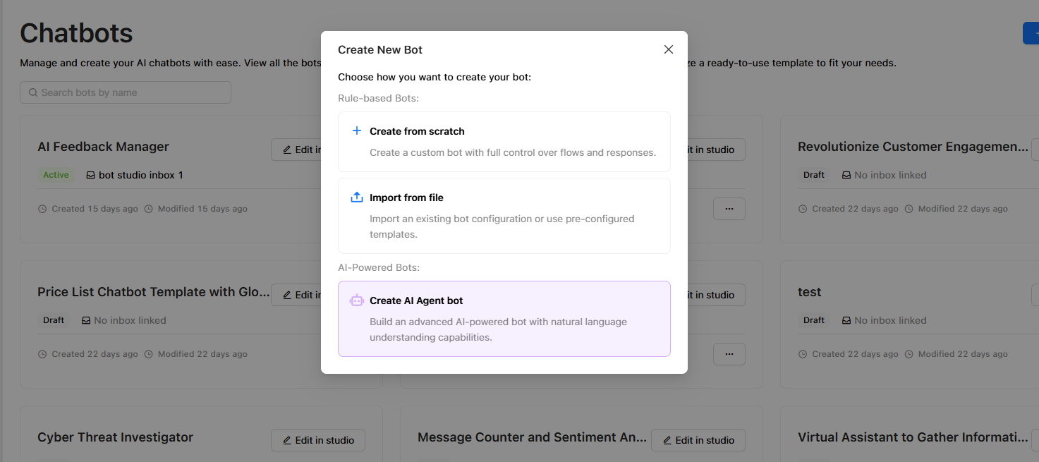 - Choose 'Create from scratch', enter the bot name, and the bot studio for this new bot will appear to start the bot building.