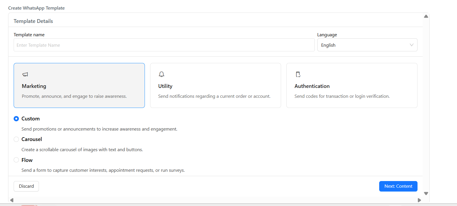 Custom– Basic message with header/body/footerCarousel– Scrollable rich-media cardsFlow– Links to an interactive WhatsApp Flow