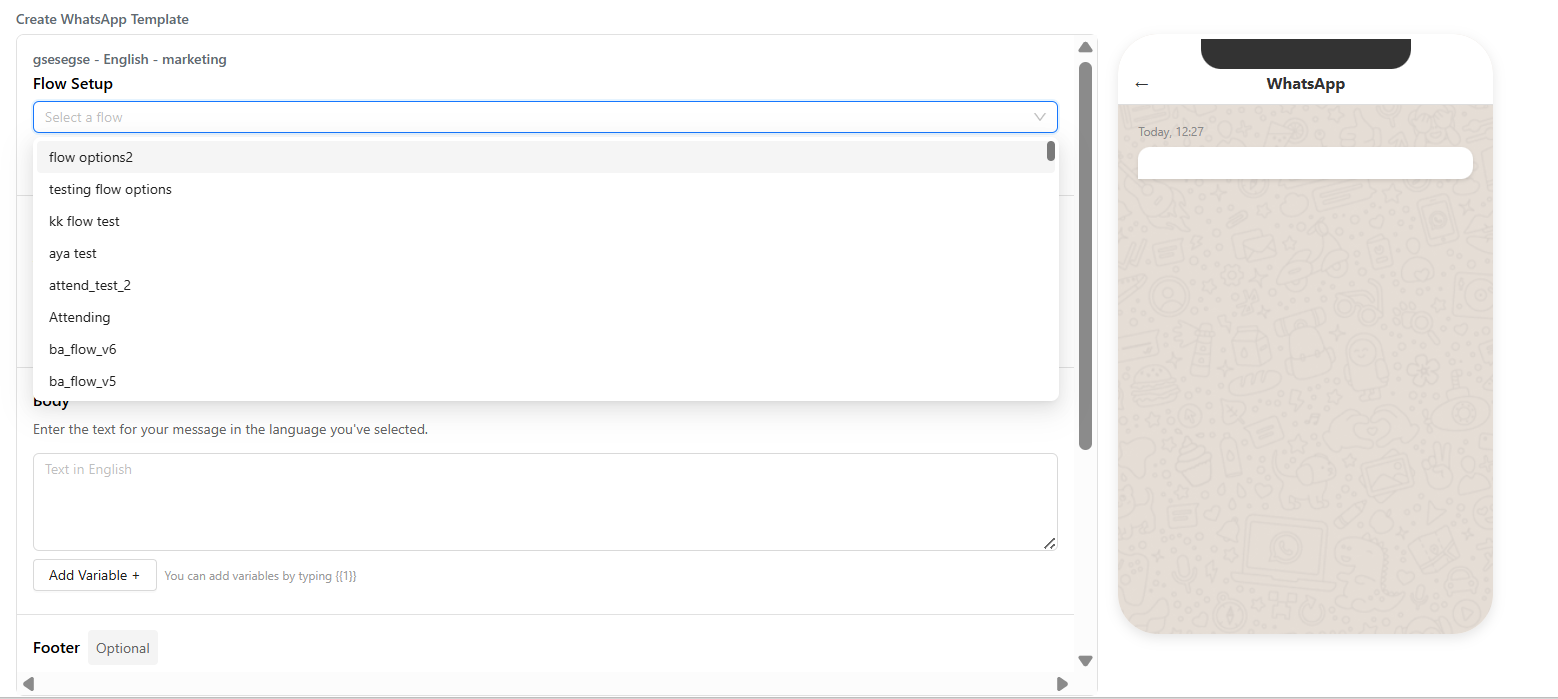 - Choose from your pre-created WhatsApp Flows (built separately in the Flows section).