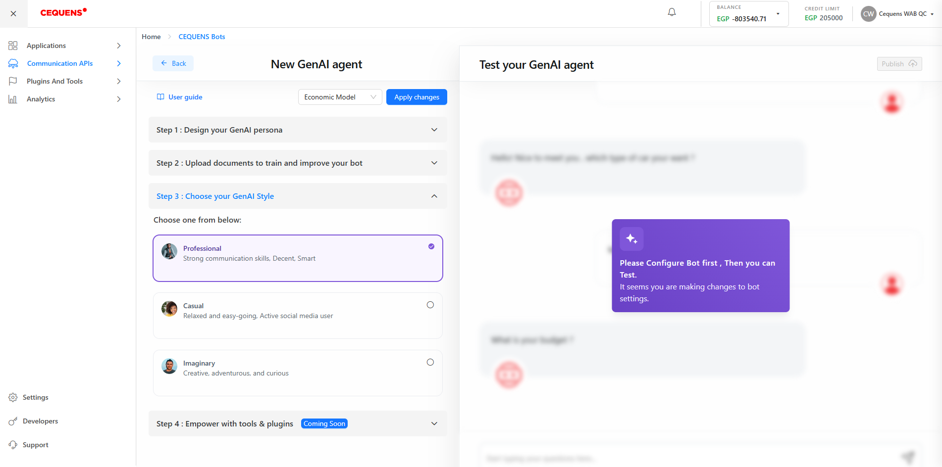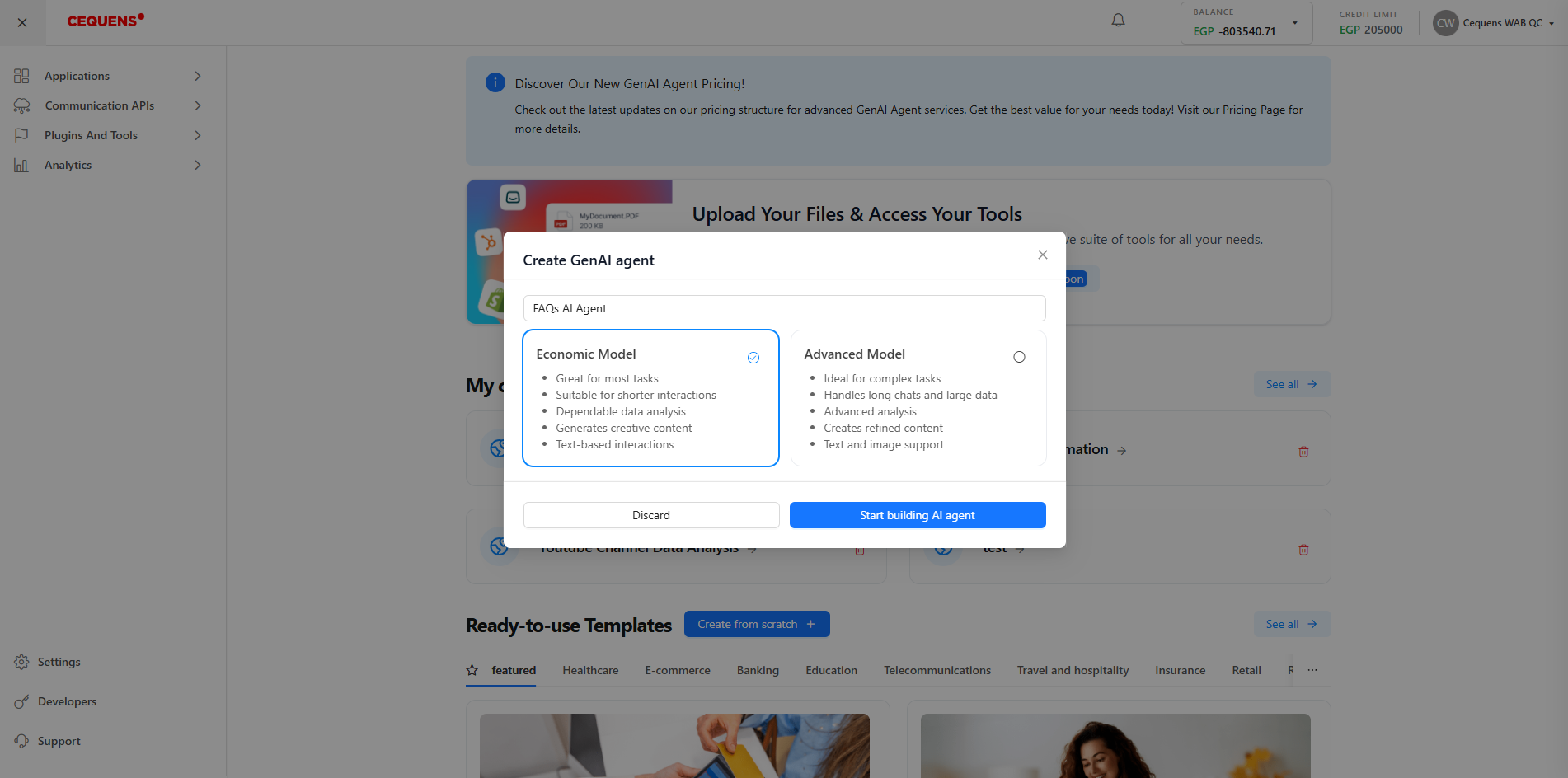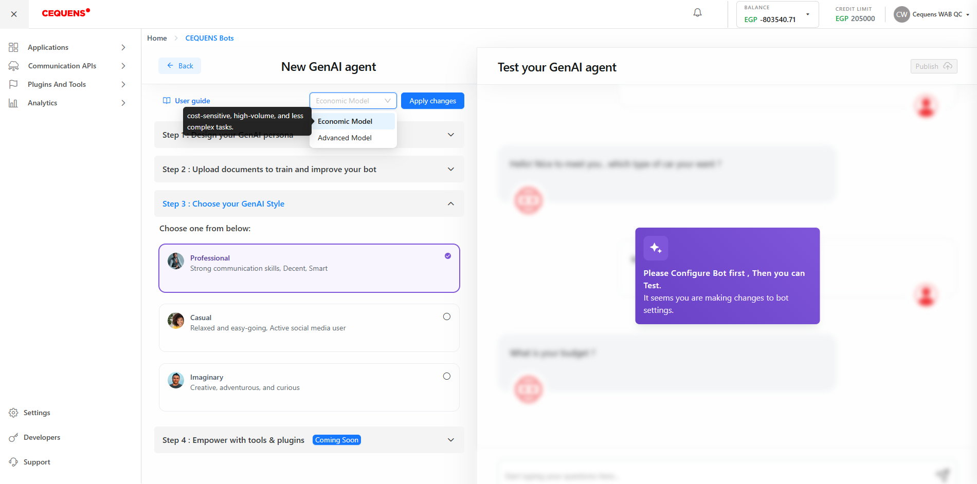 - View Supported Models: You have the option to access a dropdown menu that displays the supported models to empower your GenAI Agent. By default, the Economic model will be automatically selected. The models available for integration are:
