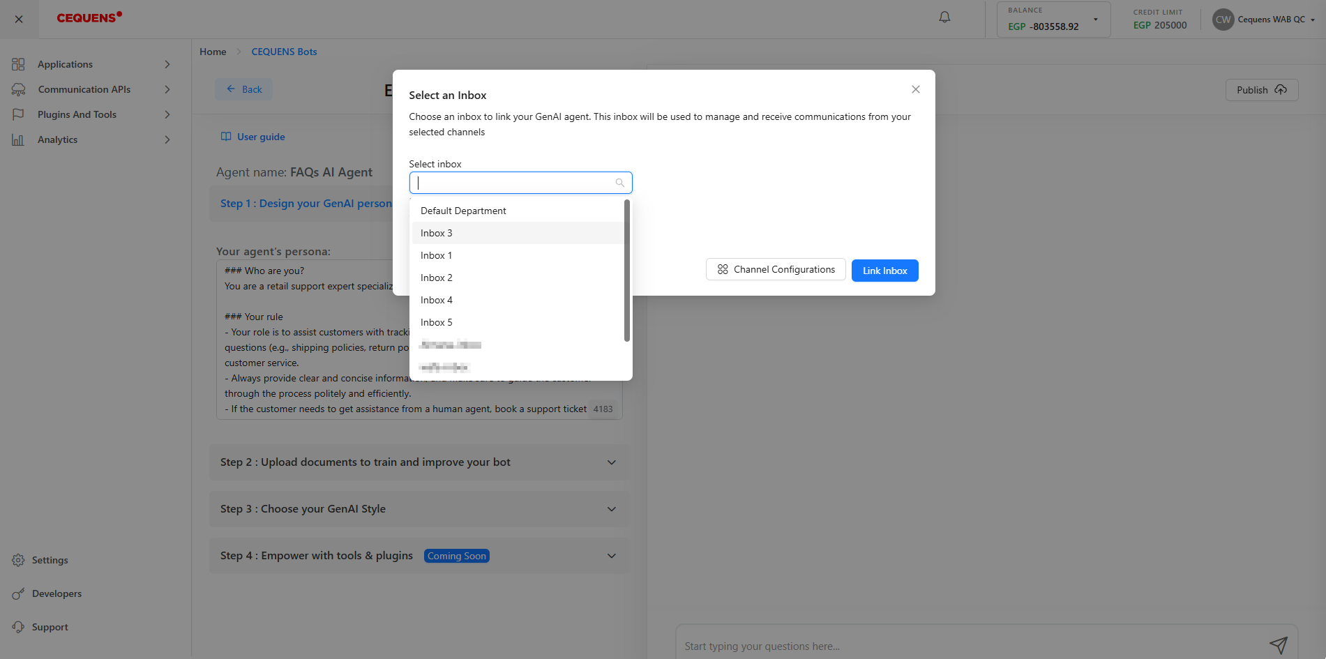 - From the 'Channel Configurations' page, where you can link the selected inbox with the below-supported channels for GenAI Agent: