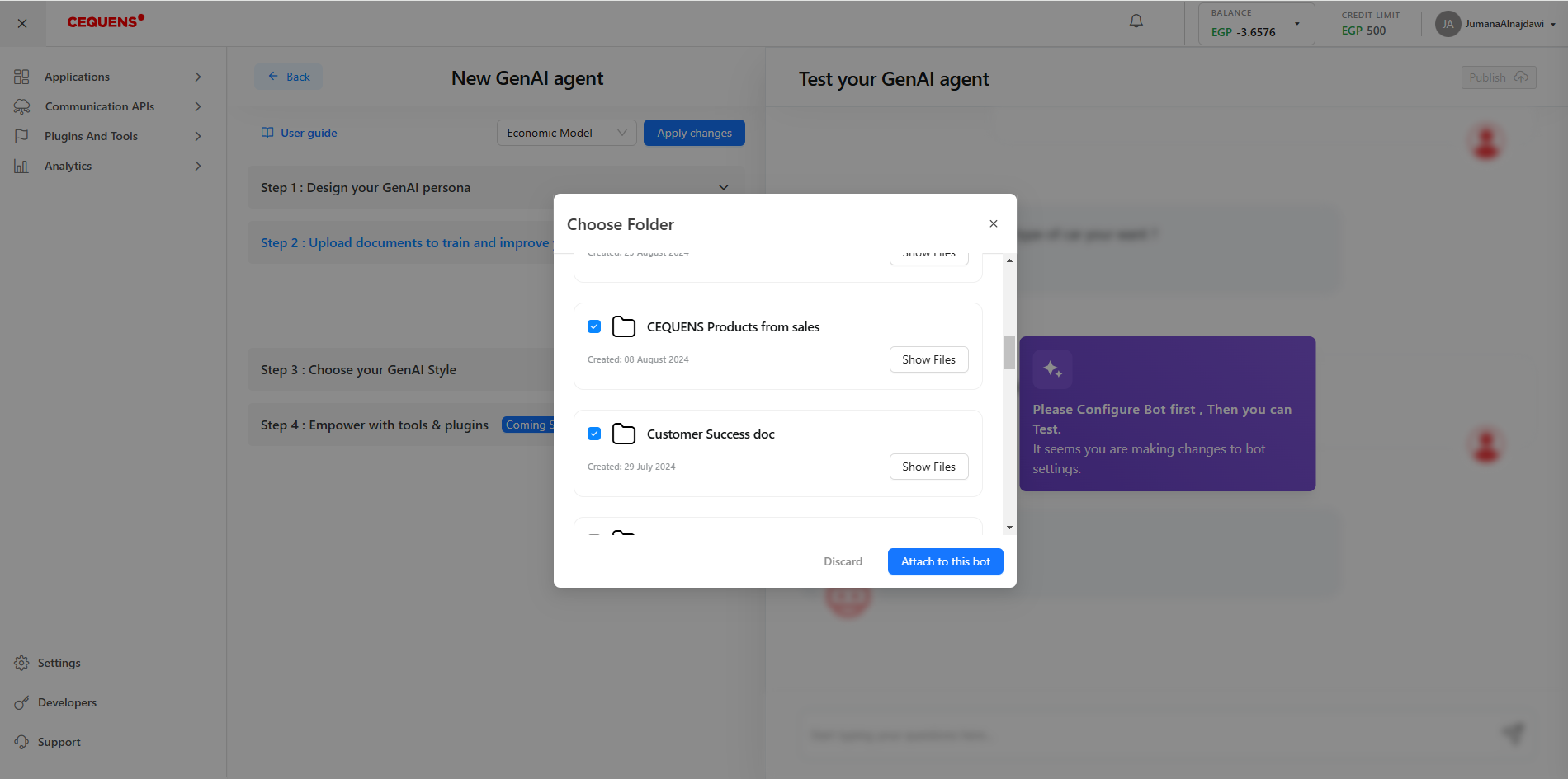 - Select Folders: When creating a GenAI Agent, you can view all created folders and select one or multiple folders to integrate as a knowledge base for the GenAI agent.