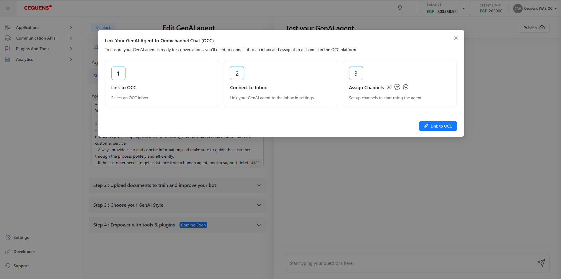 After testing the GenAI agent and deeming it ready for publication across the Omni-link Chat inboxes, select the 'Publish' button located at the top right corner of the testing section, now you will be able to link GenAI with OCC inboxes without any hustle following these steps: