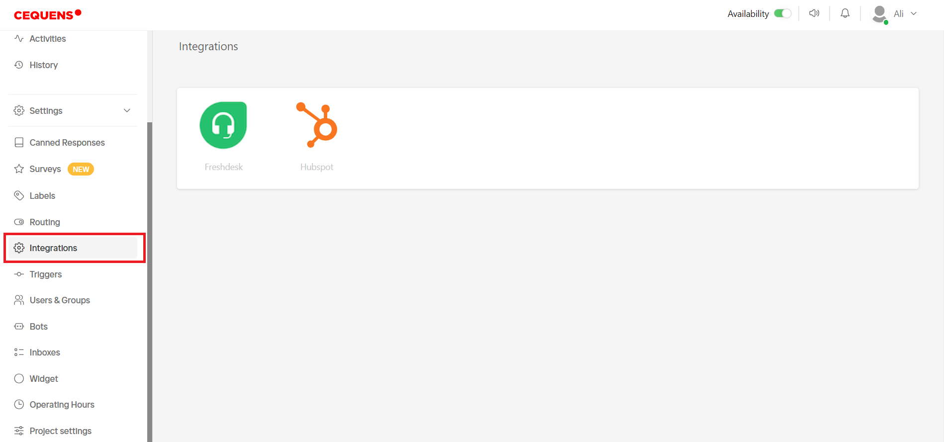 The Integrations section within CEQUENS Chat facilitates seamless integration with leading CRM platforms like Freshdesk and HubSpot. Users can effortlessly connect their CEQUENS Chat account with these CRM systems to streamline customer support operations.