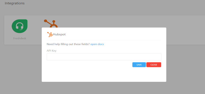 - When integrating with HubSpot, only the API key is required. Enter the API key in the pop-up window, and then click "Save" to complete the integration process.