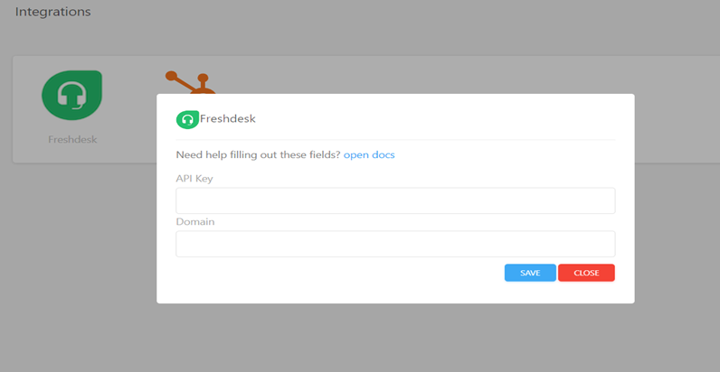 - For Freshdesk integration, you'll need to provide your API key and domain details in the pop-up window. After entering the required information, click on "Save" to finalize the integration.