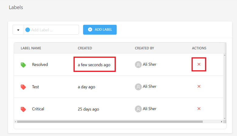 - On the listing page, you can view all labels created within the system along with their creation date and the creator's name. You also have the option to delete labels as needed by clicking on the 'X' icon in the actions column.