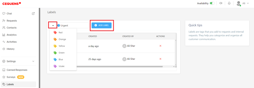 - Clicking on "Labels" from the left menu allows you to create labels for organizing your requests. Labels serve as tags that you can attach to both customer requests and internal inquiries, aiding in categorizing and managing customer communication effectively.