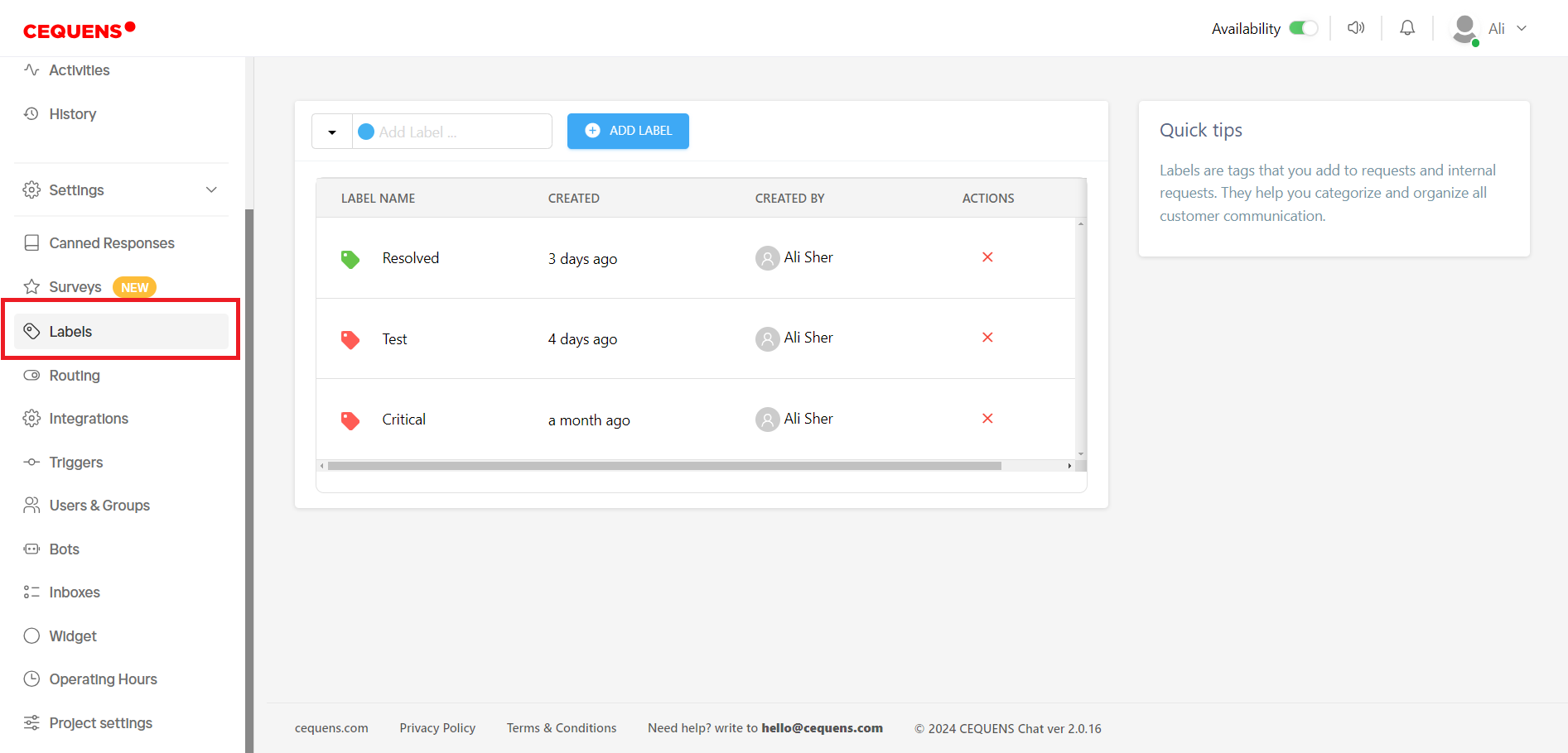- These labels are highly useful within the chat console, enabling you to easily categorize and manage customer requests according to their respective labels.