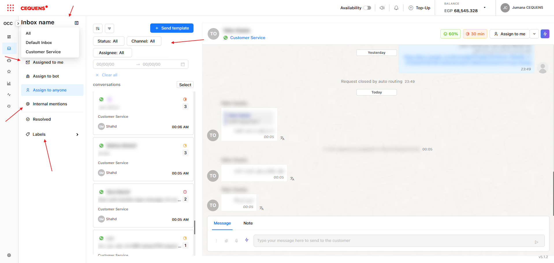 - Quick filters: all conversations, unassigned conversations, assigned to me, assigned to bot, assign to anyone/agents, conversations with internal mentions, resolved conversations & labels