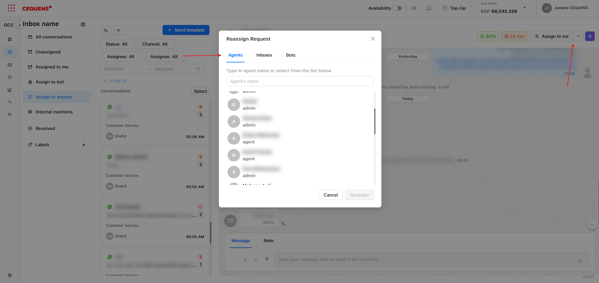 - Choose an agent, inbox, or bot from the dropdown