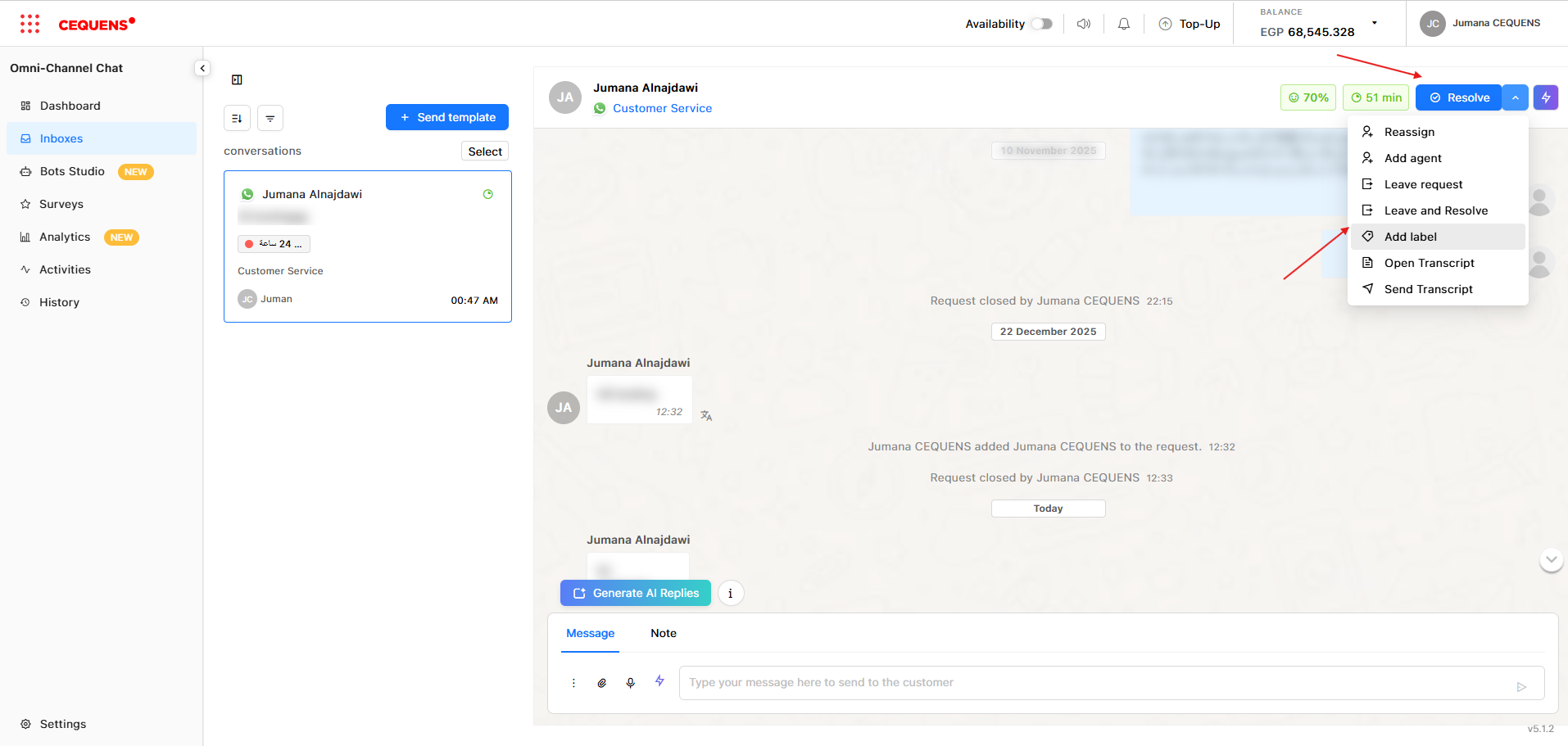 - Or select the aimed action from the dropdown list: reassign, add agent, leave request, leave and resolve, add label, open transcript, or send transcript.