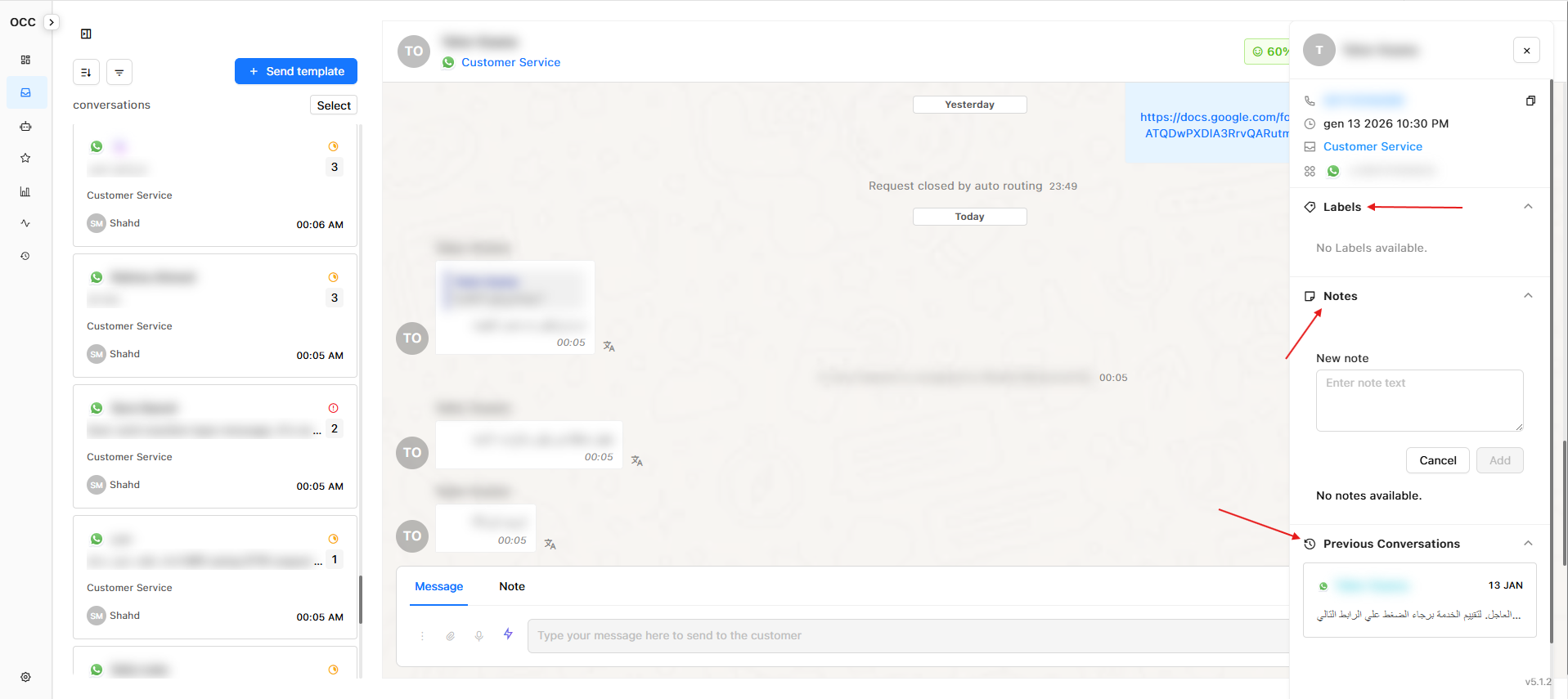View 'Previous Conversations', **labels **or **notes **added for the user's request