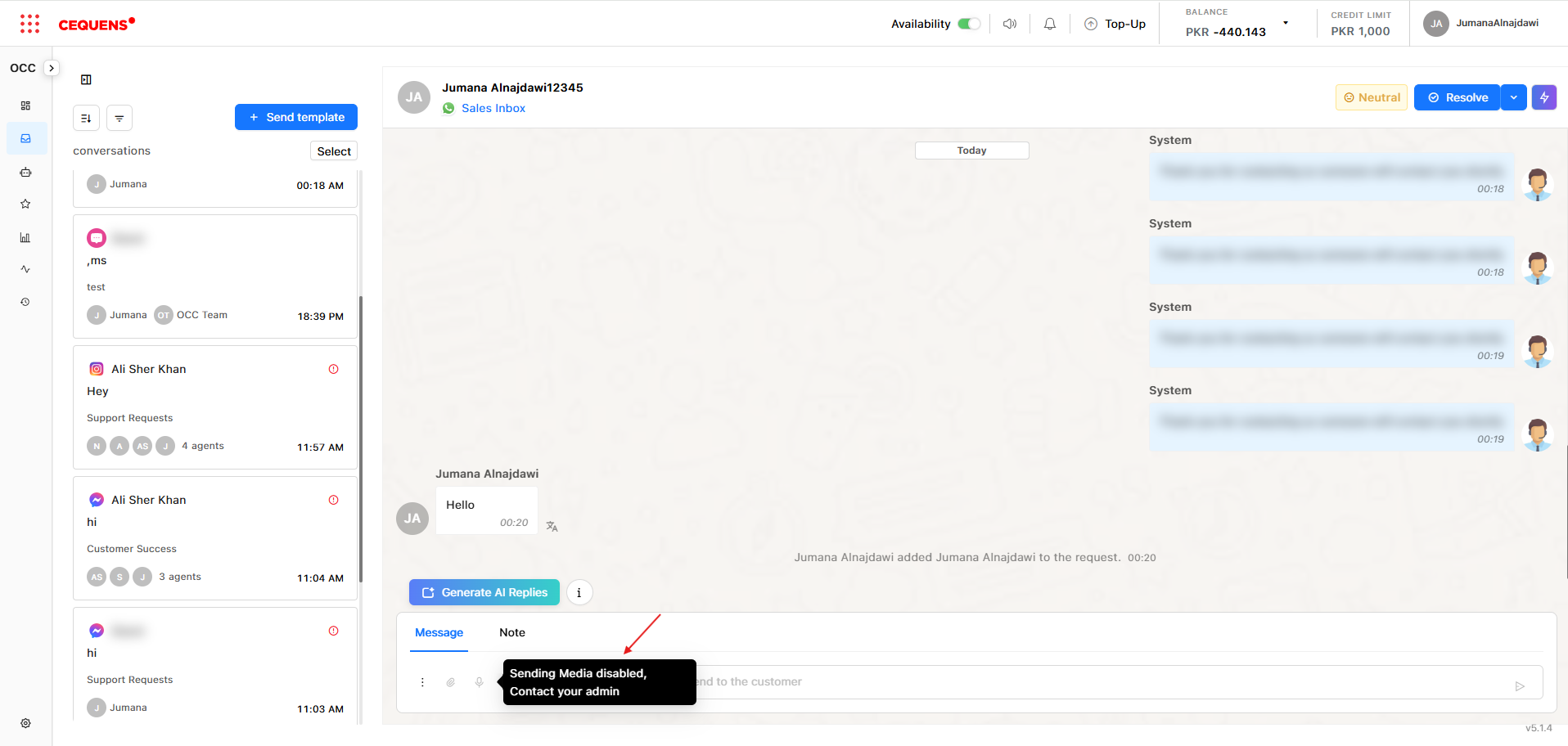 - Agents see an indicator that the customer attempted to send media