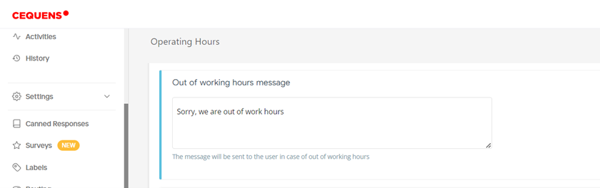 - Enter the message you wish to be displayed to users when they attempt to contact you outside of your operating hours in the "Out of Working Hours Message" field.