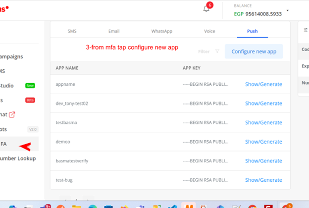 - Configure New App: Navigate to the Push tab and click on the "Configure New App" button.