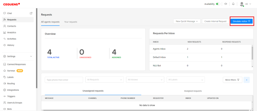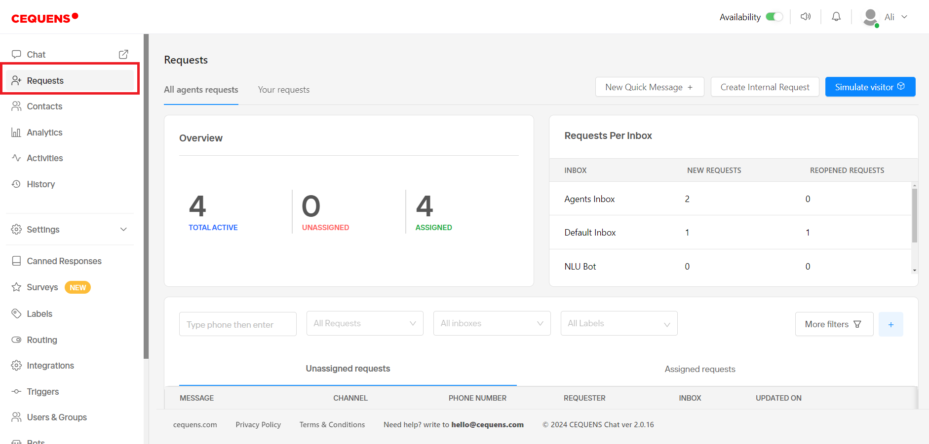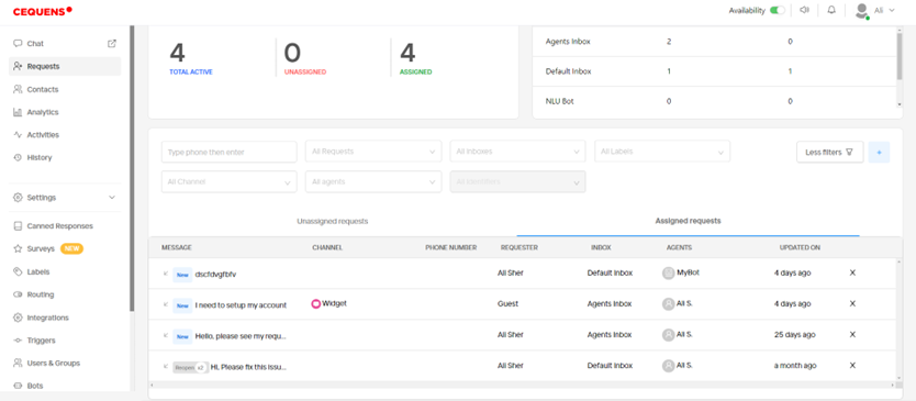 - You can track unassigned and assigned requests in the table listing. Utilize filters to refine results by inboxes, labels, channels, and agents.