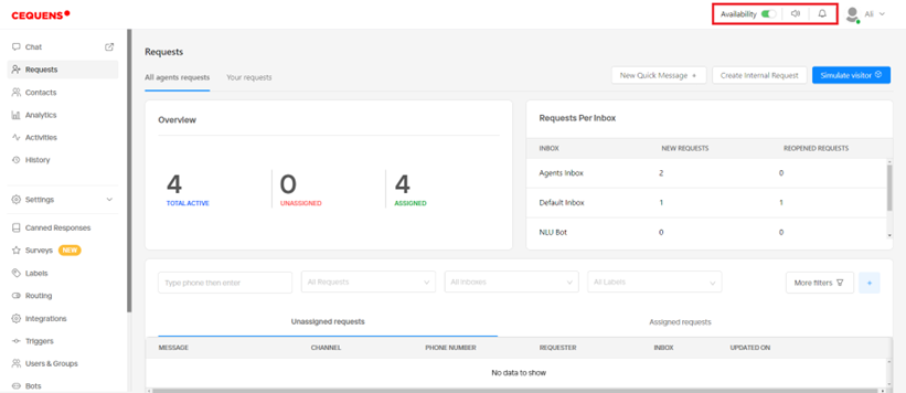 - From the top bar, you have the option to specify your availability by toggling the availability switch on or off. Additionally, you can mute the chat console by clicking the speaker icon adjacent to the availability toggle.
