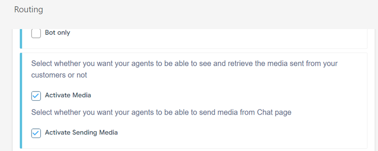 - Mark the "Activate Media" checkbox to grant agents access to view and retrieve media files sent by customers. Additionally, enable the "Activate Sending Media" checkbox to allow agents to send media files from the Chat page.