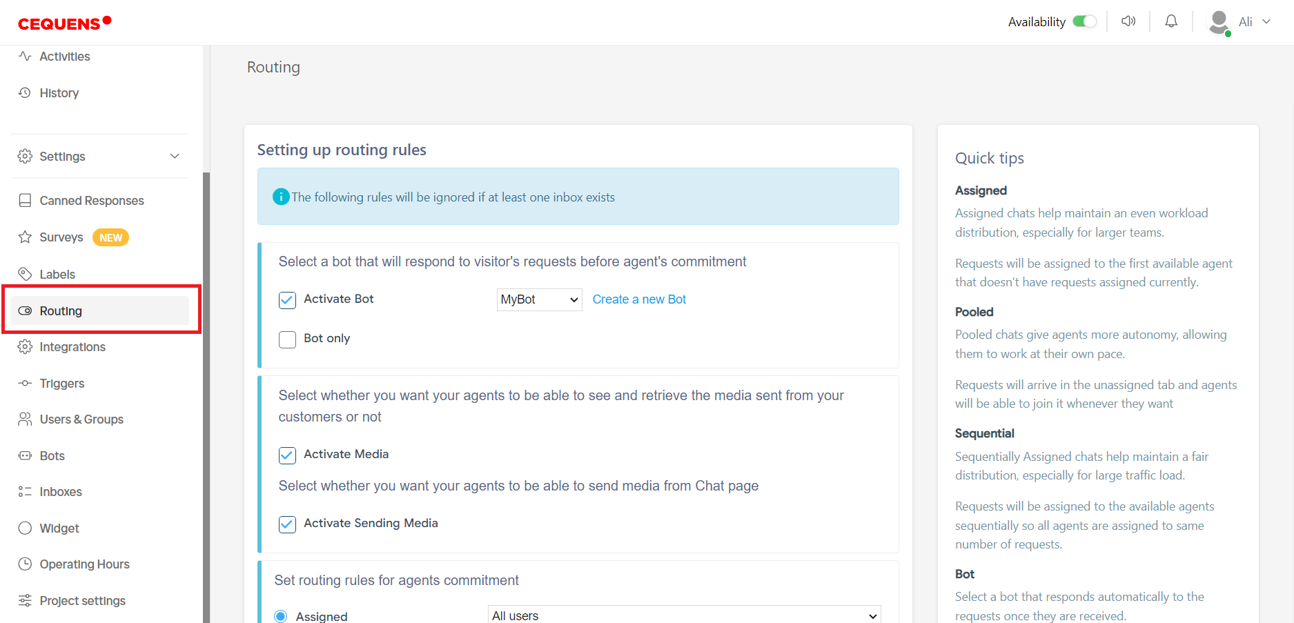 The Routing section in CEQUENS Chat offers comprehensive settings for managing inbox operations, chat handling, and bot utilization. Users can activate bots to handle visitor inquiries before agent intervention, selecting from existing bots or creating new ones.
