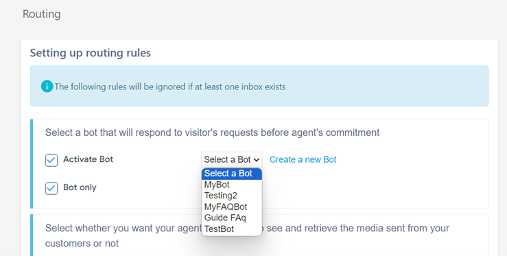 - Tick the "Activate Bot" checkbox if you wish to deploy a bot to address visitor inquiries before agents intervene. You'll then be prompted to choose an existing bot from the dropdown menu or create a new one if none is available. Selecting the "Bot Only" option ensures that the bot exclusively interacts with customers. If you have selected the option Bot Only, you cannot use the routing rules settings.