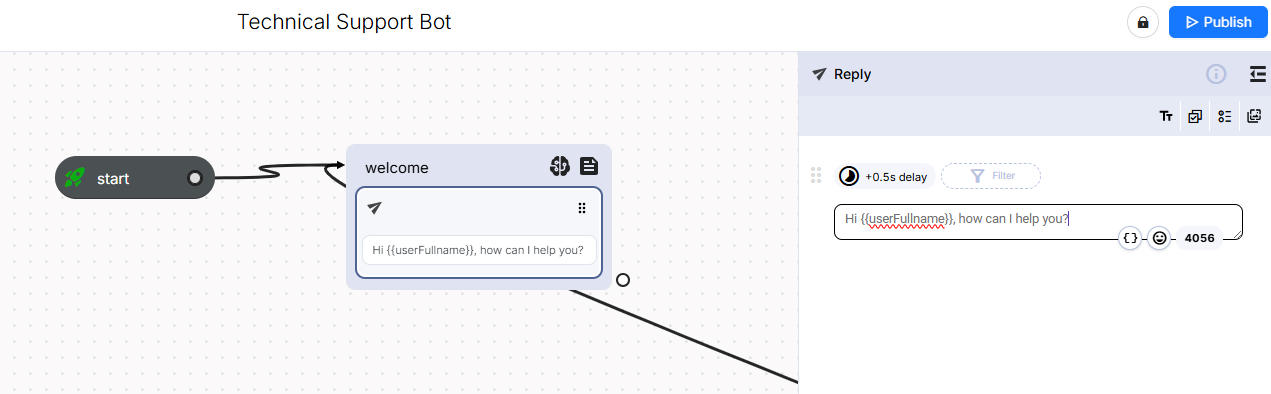 If you want to reply with simple text, the default Reply dragged on the stage is ready for the task. You only have to fill out the shown text field with the desired phrase: